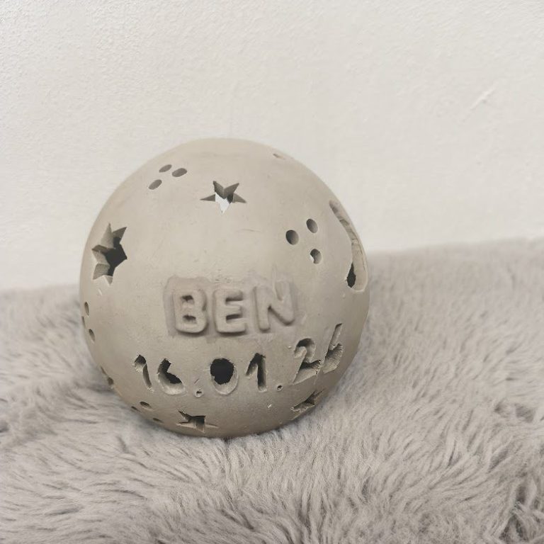 Personalisierte Lichtkugeln sind eine zauberhafte Möglichkeit, besondere Anlässe wie die Geburt eines Kindes zu feiern oder das Andenken an Sternenkinder, geliebte Menschen oder Haustiere zu bewahren. Diese handgefertigten Töpferstücke können individuell gestaltet werden, um eine persönliche Botschaft oder ein einzigartiges Design zu tragen. Sie strahlen nicht nur warmes Licht aus, sondern erzählen auch Geschichten von Liebe und Erinnerungen. Ob als Gedenkkugel im Wohnzimmer oder als liebevolles Geschenk zur Geburt - jede Lichtkugel wird mit Hingabe und Kreativität hergestellt und wird so zum nostalgischen Highlight in jedem Zuhause.